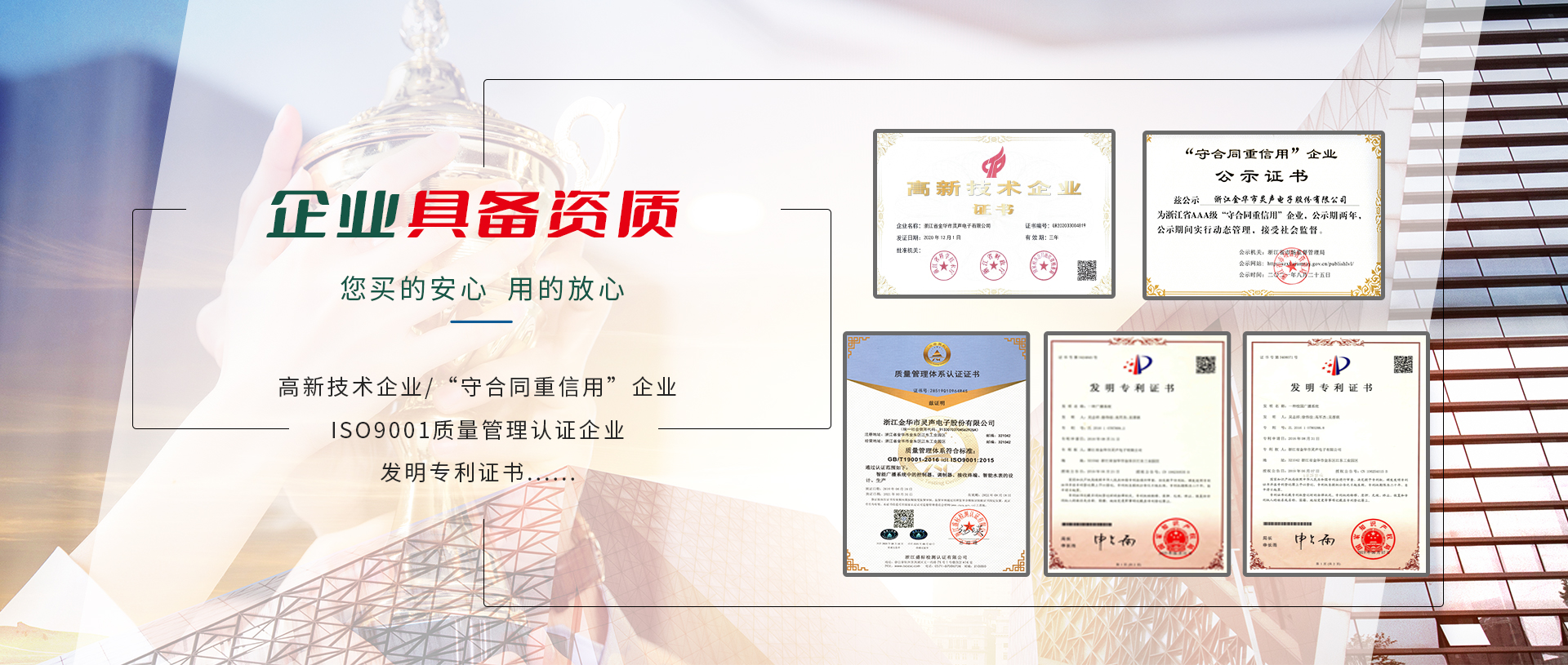 公司2001年通過ISO9001:2008國際質量管理體系認證、ISO14001:2004環境管理體系認證,相關產品通過國家CCC認證及CQC產品質量認證,并通過國家廣播電影電視新聞出版總局廣播電視設備器材入網認可。公司注重產品的質量與技術創新,現建有多條先進的總裝、檢測流水生產線及各項檢測設備所需的儀器設備。還擁有全電磁屏蔽室一個,所有高頻產品的調試均在屏蔽室中進行。公司組建了高素質的管理隊伍,設有研發部、生產部、銷售部、采購部、質檢部、售后服務中心及財務部等部分,并與國內多家大專院校、科研單位建立長期合作關系,成立了近乎是技術研發中心,是金華市職業技術學院重點示范實習基地。公司產品先后被浙江、江蘇、重慶、四川、甘肅、山東、湖南、湖北、貴州等文廣新局、電視臺、氣象局普遍采用,覆蓋全國各省市800多家縣(市)文廣新局、廣播電視臺,并廣泛采用于教育行業,尤其是在近年來的農村應急廣播“村村響”工程中,靈聲公司中標承建的“村村響”工程贏得了各省市廣播電視劇領導、專家們的一致好評!